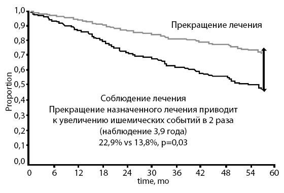 Показано, что у пациентов с перенесенным ОКС досрочное прекращение антиагрегантной терапии в последующем повышает риск смерти и повторного инфаркта миокарда (см. рис. 17).
