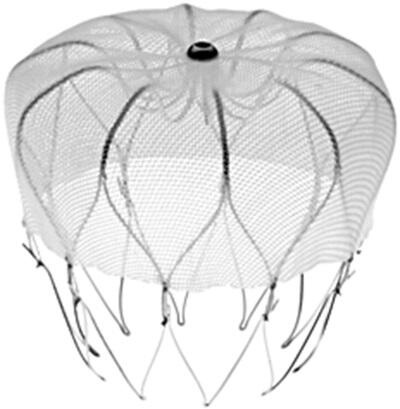 Учитывая эти особенности, в настоящее время разработаны и активно внедряются и исследуются специальные устройства, препятствующие тромбообразованию в ушке левого предсердия. Так, например компанией WATCHMAN разработан чрескожно имплантируемый окклюдер ушка левого предсердия, который применяется активно в США и Израиле. Это устройство внешне напоминает зонтик (см. рис. 19) и имплантируется хирургическим путем в ушко левого предсердия, где «раскрывается» и тем самым выключает его из кровотока и делает невозможным образование в нем тромботических масс, а следовательно, и развитие кардиоэмболического инсульта.