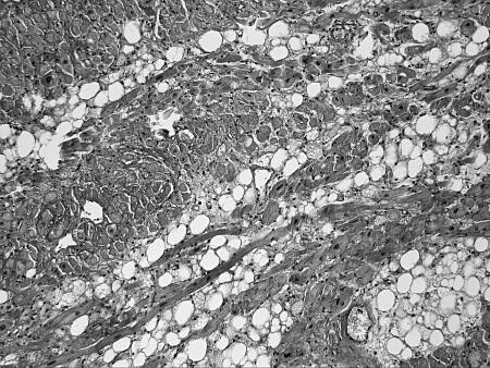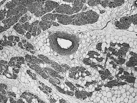липоматоз, склероз и гиалиноз стенок артерий (см. рис. 5 д).