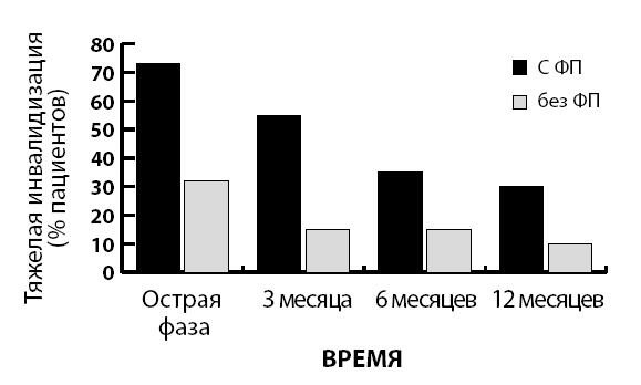 Подтверждением этих данных являются собственные результаты проведенных аутопсий в 2011 году среди всех пациентов, умерших от инсульта (n=198) в многопрофильном стационаре города Москвы. При этом оказалось, что 43 % имели ФП неклапанного происхождения. Причем повторный инсульт встречался достоверно чаще в группе пациентов с ФП, что увеличивает значимость не только первичной, но и вторичной профилактики инсульта у данной категории пациентов (Верткин А.Л. и соавт., 2012 год). Более того, известно, что половина пациентов с инсультом в исходе ФП умирают в течение первого года после перенесенного нарушения мозгового кровообращения [39]. Кроме того, по данным Фрамингемского исследования, инсульт, ассоциированный с ФП, приводит к более тяжелой инвалидизации больных, причем как в остром периоде, так и в течение последующих 12 месяцев (см. рис. 6) [39, 5].