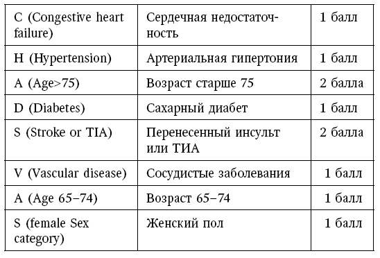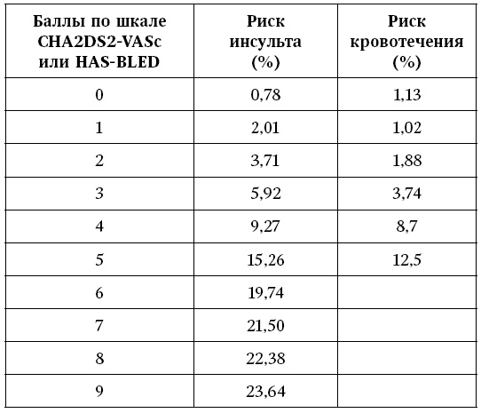 Риск развития инсульта и других тромботических осложнений возрастает пропорционально увеличению суммы баллов по шкале.
