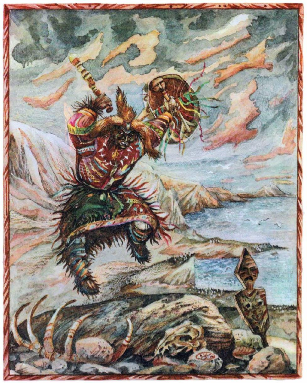 Увидал шаман ножи, топоры и бусы, что Моислав Попович на земле разложил, в глазах огонёк загорелся. Недобрый, жадный. Снял с шеи человечка, к каждому предмету приложил, поднёс к уху, затем сам что-то прошептал. Снова на шею повесил. Выхватил вдруг у помощника бубен, в пляс пустился.