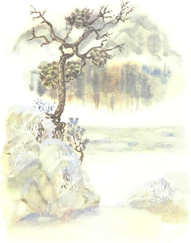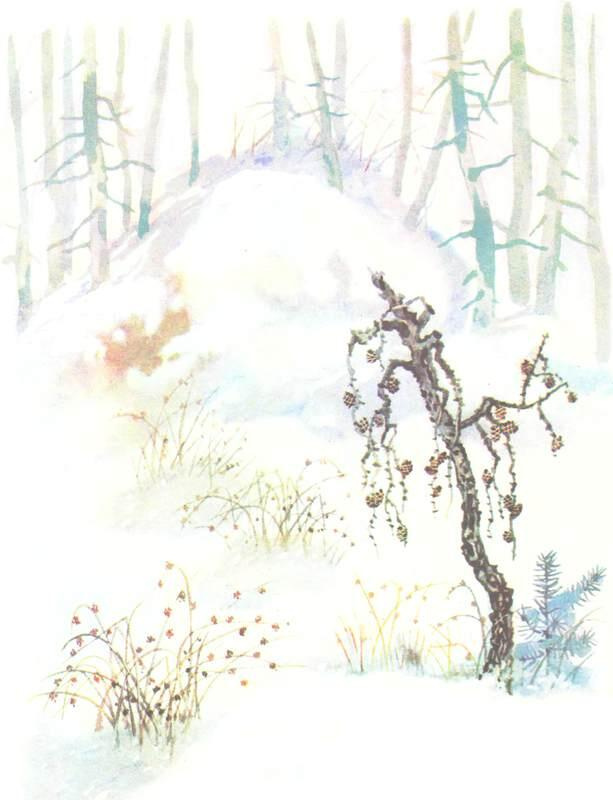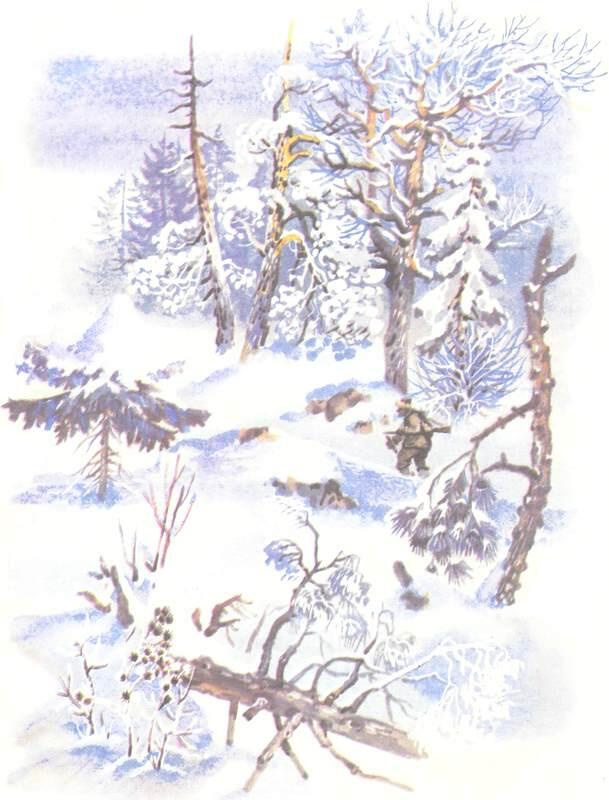 Трудная дорога вела с зимовья на Колву. Сначала пришлось идти на лыжах по Студеной. Это было легко, но потом начались горы, и старик скоро выбился из сил. Прежде-то, как олень, бегал по горам, а тут на двадцати верстах обессилел. Хоть ложись и помирай Выкопал он в снегу ямку поглубже, устлал хвоей, развел огонька, поел, что было в котомке, и прилег отдохнуть. И петушка закрыл котомкой С устали он скоро заснул. Сколько он спал, долго ли, коротко ли, только проснулся от петушиного крика.