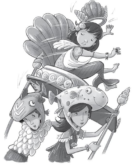 Ребята собрались во дворике, чтобы увидеть это зрелище. Когда четыре подростка с головными уборами в виде огромных рыб прошли вдоль дома раздались фанфары. Каждый держал в руках край длинного шеста. А поверх шестов был водружён огромный трон в виде морской раковины!