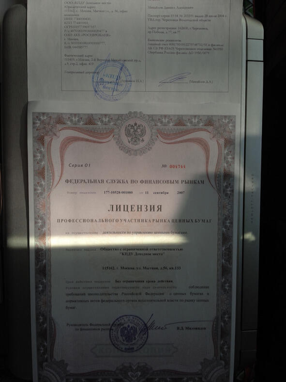 Итак, в сентябре 2009 года начал другое обучение в институте под названием Общество с ограниченной ответственностью «Компания по Доверительному Управлению на Рынке Ценных Бумаг Доходное место», или сокращённое название ООО «КПДУ Доходное место», в роли финансового консультанта.
