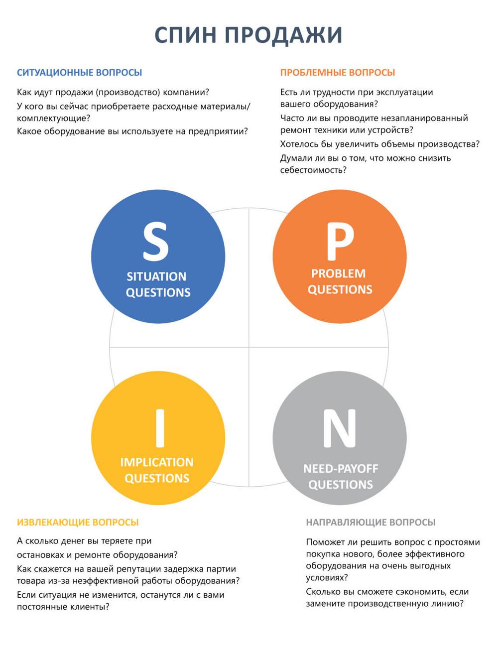 Рассмотрим технику СПИН на вопросах, которые бы задавал консультант, продающий оборудование производственному предприятию. Каждый элемент аббревиатуры обозначает тип задаваемых клиенту вопросов: