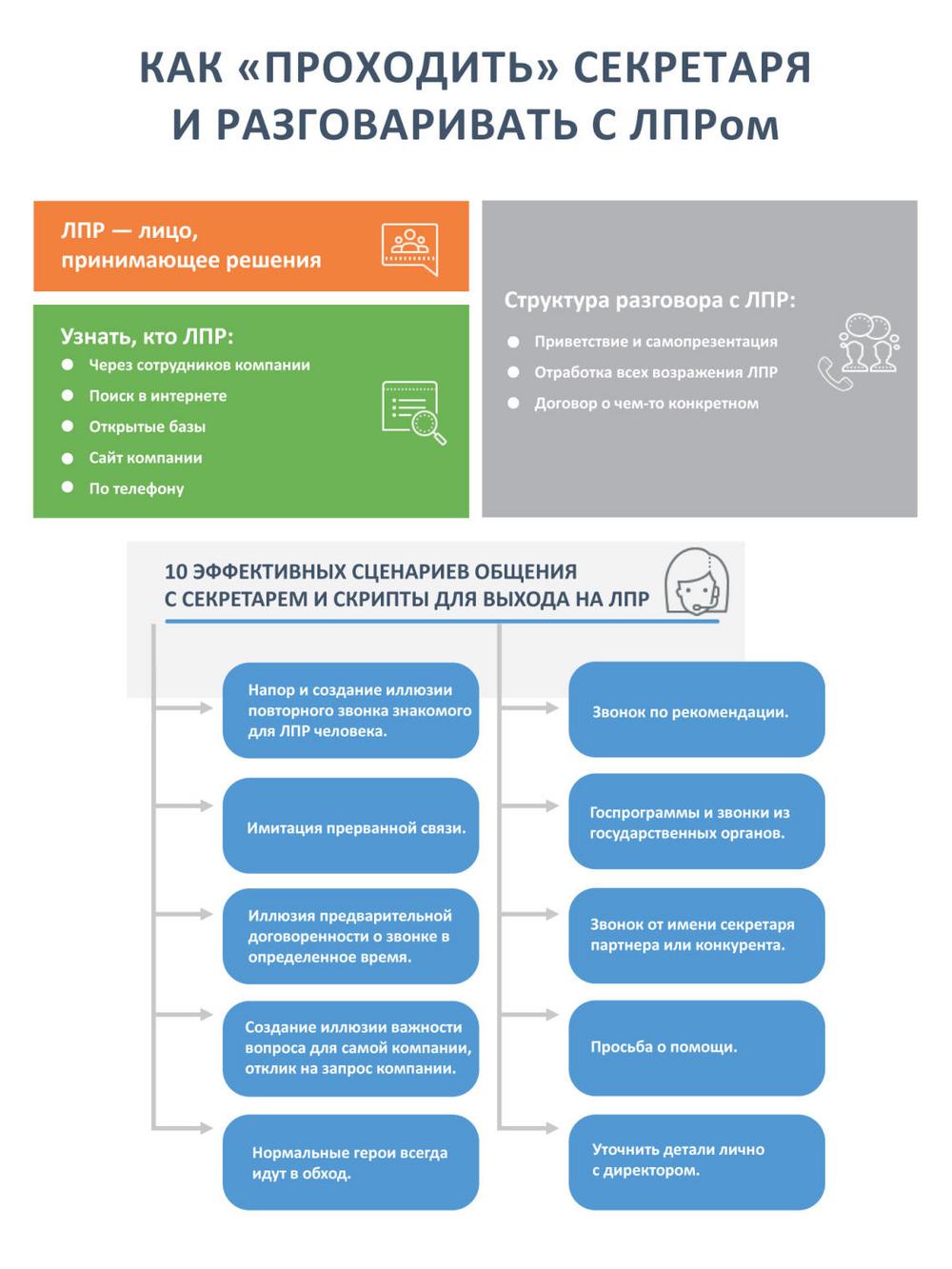 ЛПР лицо, принимающее решения самый важный человек на другом конце провода. От него зависит эффективность телефонных переговоров о продаже. По этой причине так важно вести переговоры именно с ним. Но это довольно сложная задача, ведь придется сначала выяснить кто это, а затем пробить оборону, которую держит секретарь. Зачастую цель можно достичь с помощью приемов разведки. Кто является ЛПР в каждой конкретной ситуации зависит от обстоятельств:
