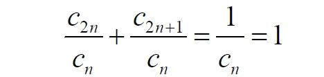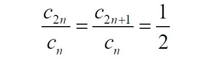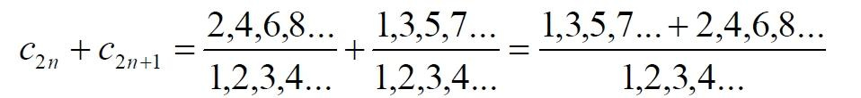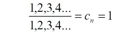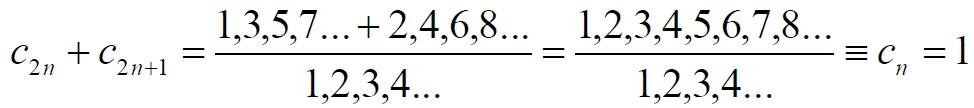 Это определённо означает, что мощности множеств всех натуральных чисел и суммы множеств всех четных и нечетных чисел равны. Но это также означает и тождественное равенство их бесконечного количества членов. Очевидно, что множества четных и нечетных чисел равномощны, поэтому, разделив полученное равенство на cn, получим:
