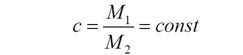 Рассмотрим приведённый выше пример в терминах мощностей. Примем без доказательства, что количество членов множества и его мощность это разные, но схожие по смыслу понятия. Мы не можем сравнивать число членов множеств, по определению равных бесконечности, но мы можем сравнивать их мощности. Отношение мощностей М1 и М2 равномощных множеств всегда равно конечному числу: