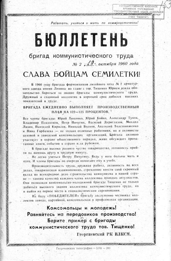 В порядке контроля за этой работой бюро райкома ВЛКСМ 30 января 1959 года заслушивает отчет комитета комсомола арматурного завода бригадах, борющихся за право называться бригадами коммунистического труда, в июле 1960 года обсуждает вопрос о работе бригад и ударников коммунистического труда на кирпичном заводе совнархоза. Ставропольский крайком ВЛКСМ в целом положительно оценивает участие молодежи района в движении за коммунистический труд. В докладе на 1-м краевом слете бригад коммунистического труда отмечалось, что первыми в Георгиевске в борьбу за право называться коллективом коммунистического труда вступила комсомольско-молодежная бригада 3 маслоэкстрационного цеха маслозавода во главе со сменным мастером Галиной Романовной Коваль. В составе бригады комсомольцы и молодежь Земин Андрей, Галина Вяткина, Зоя Нурбекьянц, Виктор Ковалев, Нина Еременко, Галина Сычева, Анатолий Александрьян, Лариса Беловелова. А в постановлении бюро крайкома ВЛКСМ от 29.06.60 г. «О выполнении заповедей бригадами и ударниками коммунистического труда в Георгиевском районе» приводятся данные, что из 107 комсомольско-молодежных коллективов 17 уже добились высокого звания коллектива коммунистического труда, более 2-х тысяч юношей и девушек борются за право стать ударниками. Образцы нового отношения к делу показывают бригады коммунистического труда с арматурного завода Васильченко и Дорошенко, которые стали работать без мастера, получив годовую экономию в 12 тысяч рублей. Большинство членов бригад рационализаторы. Только за 5 месяцев текущего года ими подано 48 рацпредложений с годовым экономическим эффектом 274 тысячи рублей.