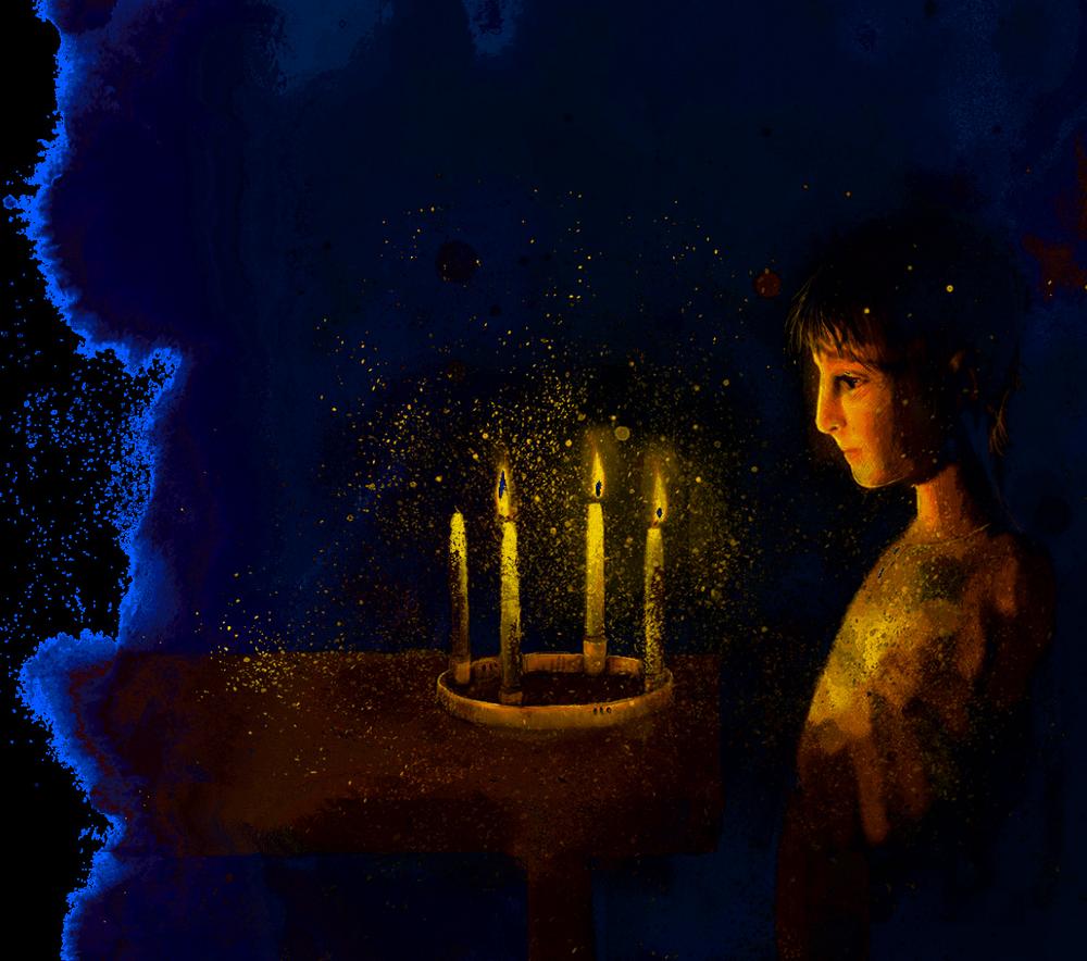 Я вынул четыре штуки и вставил их в подсвечник. Свечи никак не хотели стоять ровно, поэтому я подоткнул их фольгой я видел, папа всегда так делал. Я зажёг свечи и отступил на несколько шагов назад.