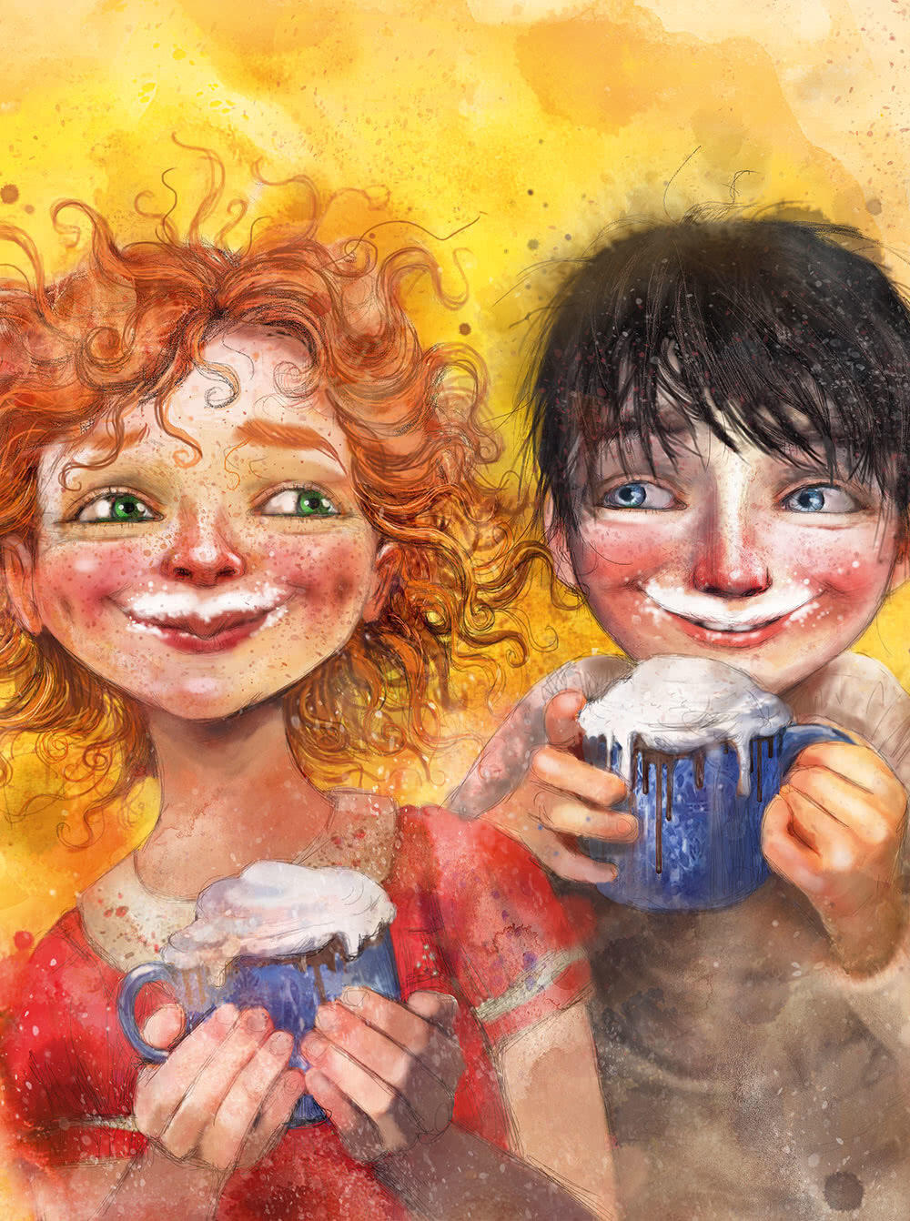За дверью оказалась просторная, покрашенная в голубой цвет кухня. Здесь так вкусно пахло едой и имбирным печеньем, что у меня опять засосало под ложечкой. На стенах висели сковородки и кастрюли, а у плиты стояла большая крынка в цветочек с воткнутыми в неё поварёшками и венчиками. Хедвиг явно привыкла здесь хозяйничать. Она сняла с одного из крючков на стене кастрюлю, поставила её на плиту, достала из большущего холодильника молоко, нашла в одном из ящичков шоколад, налила молоко в кастрюлю, покрошила туда шоколад, вытянула из цветастой крынки венчик и стала размешивать.