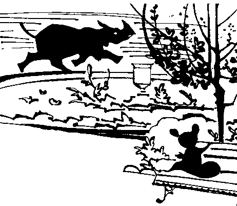 Чтобы разобраться в этой путанице, Чебурашка отскочил в сторону. И пока носорог один носился по кругу, Чебурашка спокойно сидел на лавочке и размышлял.