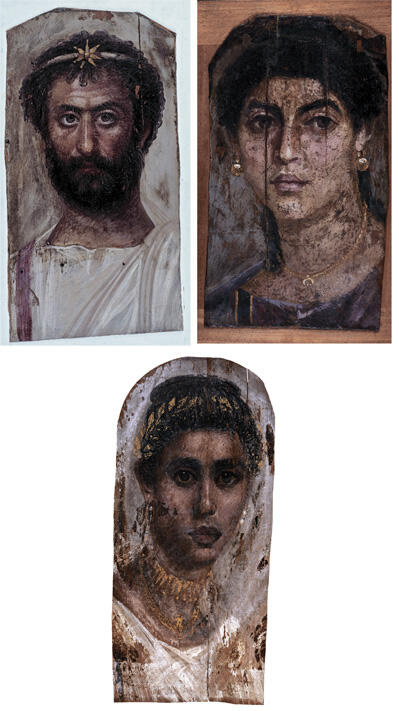 13, 14, 15. Три портрета с египетских саркофагов времен Римской империи, хотя и написаны в конце I начале II в., выглядят поразительно современно. Мужчина вверху слева, судя по его головному убору, был, вероятно, священником; женщина справа изображена одетой в темно-лиловое платье (в ее серьгах играют блики света, сделанные мазками белой краски); на портрете знатной молодой женщины внизу справа венец и изысканные драгоценности выполнены из сусального золота.