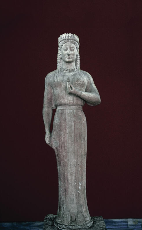 Ни одно изваяние не убеждает в этом так, как мраморный памятник молодой женщине, обнаруженный в 1970-х в окрестностях Афин. Ее имя высечено на подножии Фрасиклея, что означает «знающая о собственной славе». Созданное около 550 г. до н. э., это изваяние считается одним из красивейших надгробных памятников античного мира. Девушка навечно облачена в лучшее свое узорчатое платье. Сохранившиеся следы красного пигмента напоминают о том, что большинство статуй в Древней Греции были ярко, даже чересчур ярко, раскрашены. А странная улыбка девушки, которая так часто встречается у ранних греческих скульптур, словно обещает «настоящую жизнь» в мраморе. Ибо во всем мире улыбаются только живые люди.