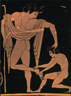 11. Изображение атлета и его раба на кратере (сосуде для смешивания вина и воды) V в. до н. э. наглядно демонстрирует иерархию. Крошечный раб склоняется к ногам своего господина, который с силой опирается о его голову.