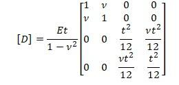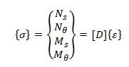 Зенковичем [14,с.259] приводится следующая запись матриц перемещений {ε}, напряжений {σ} и упругости [D] в соответствии с четырьмя результирующими напряжениями на рисунке при φ = const (верхняя часть матриц соответствует мембранным усилиям, нижняя часть матриц соответствует изгибным жесткостям, сдвиговые части матриц не показаны):