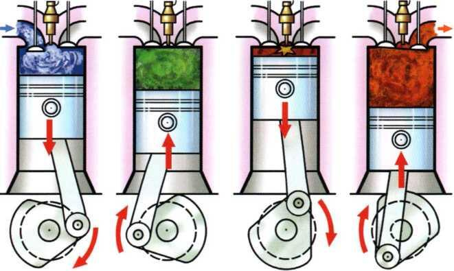 Только благодаря бензиновому мотору, четырехтактному двигателю внутреннего сгорания, удалось построить настоящий автомобиль. Создателем этого двигателя был немецкий изобретатель Николаус Отто. Название «четырехтактный» означает, что в цилиндрах мотора один за другим происходят четыре действия, четыре такта: засасывание горючей смеси, сжатие ее и поджигание электрической искрой, рабочий ход и выталкивание отработавших газов.