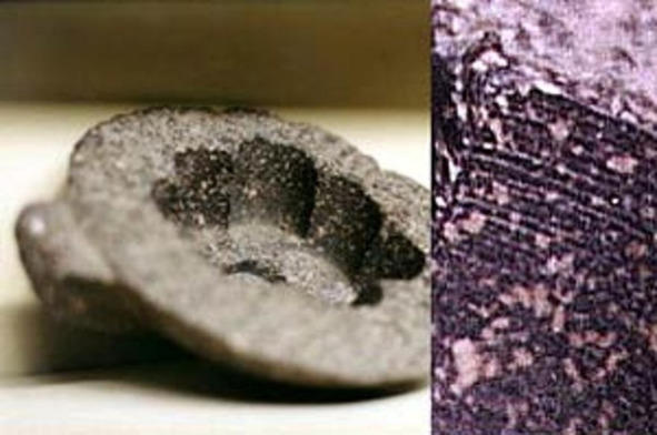 Разве возможно такое в эпоху бронзового века? Вполне возможно. Принцип работы камнерезного станка заключался в следующем: на массивную гранитную ось (для придания большой кинетической энергии) устанавливался бронзовый диск большого диаметра (где крепился диск, там сечение оси не круглое, а квадратное, диск основательно закреплялся бронзовыми клиньями). Вся эта конструкция прочно монтировалась на деревянной станине. Затем на ось наматывалась веревка, длиной от 100 до 500 метров. Веревку за один конец тянул вол, веревка раскручивалась и заставляла набирать диск приличные обороты (веревочный двигатель). Если веревку сделать длинной 500 метров, то время вращения будет длится около 10 минут, что даже для современного станка, это большое время. Станок мог быть многоскоростным: веревку наматывали на вал большого диаметра, чтобы начать вращение, затем на определенной длине веревка переходила на ось меньшего диаметра, диск начинал вращаться с еще большей скоростью. Длина веревки на местности помечалась колышком, который сигнализировал, что надо отцеплять веревку от вола. Массивная каменная ось продолжала по инерции вращаться и накручивала опять на себя веревку. Надо было использовать двух волов один тянул конец веревки, второй возвращался на исходную точку. Также, чтобы диск эффективно резал гранит, сыпали под диск абразивный песок и лили слабый раствор соляной кислоты. Если внимательно рассмотреть рез фрезы, то можно заметить, что след, оставленный диском, не сплошной, а с уступами через 23 сантиметра. Это говорит о том, что камнерезный инструмент через малый промежуток времени постоянно останавливался. Следовательно, циркулярную пилу приводил в действие не электродвигатель. Можно допустить, что фреза могла оставить более глубокий след, но только каменным материалом мог служить не затвердевший на тот момент полимерный гранитный бетон.