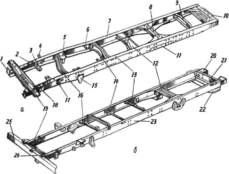 а КамАЗ 5320; б Урал 4320; 1 кронштейн крепления переднего буфера; 2 кронштейн крепления жидкостного радиатора; 3, 5 кронштейны крепления двигателя; 4, 17 кронштейны крепления верхнего ушка амортизатора; 6 кронштейн; 7, 14, 23 лонжероны рамы; 8, 9, 10, 12, 14, 16, 19, 21 поперечные балки; 11 подкладка кронштейна задней подвески; 15 задний кронштейн передней подвески; 18 передний кронштейн передней подвески; 20 задний буфер; 22 поперечина сцепного устройства; 24 буксирный крюк; 25 передний буфер