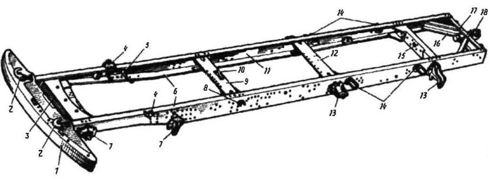 1 передний буфер; 2 буксирные крюки; 3 передняя поперечина; 4 кронштейн амортизатора; 5 кронштейн задней опоры двигателя; 6, 11 лонжероны рамы; 7 кронштейн передней рессоры; 8 кронштейн платформы; 9, 12, 15, 17 поперечины рамы; 10 кронштейн подвесной опоры; 13 кронштейн задней рессоры; 14 опорные кронштейны подрессорника; 16 раскосы; 18 тягово-сцепное устройство