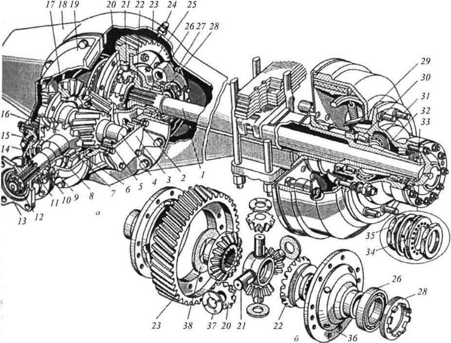 а общий вид; б дифференциал; 1 полуось; 2, 15 прокладки; 3, 27 крышки; 4 вал; 5, 7, 10, 26, 30 подшипники; 6 канал; 8 втулка; 9 кольцо; 11, 29, 34 манжеты; 12, 28, 35 гайки; 13 фланец; 14, 25 корпуса; 16, 17, 23 шестерни главной передачи; 18 балка; 19 картер; 20 сателлит; 21 крестовина; 22 полуосевая шестерня; 24 сапун; 31 ступица; 32 наконечник; 33 контргайка; 36 коробка дифференциала; 37, 38 шайбы