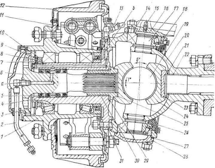 1 ступица; 2 шланг подвода воздуха; 3 подшипник; 4 цапфа поворотная; 5 манжета системы накачки шин; 6 полуось наружная; 7 контргайка; 8 штифт; 9 шайба замков; 10 гайка подшипников; 11 цилиндр колёсный тормозной; 12 барабан тормозной; 13 манжета ступицы; 14 втулка конусная разрезная; 15 маслёнка; 16 рычаг; 17 шкворень поворотного кулака; 18 корпус поворотного кулака; 19 диск шарнира; 20 опора шаровая; 21, 29 шайбы упорные; 22 втулка бронзовая; 23 полуось внутренняя; 24 кулак шарнира; 25 вилка шлицевая наружной полуоси; 26 манжета шаровой опоры; 27 прокладки регулировочные; 28 крышка подшипника поворотного кулака; 30 втулка поворотной цапфы;31 шпилька; а отверстие резьбовое; b канал в цапфе для подвода воздуха