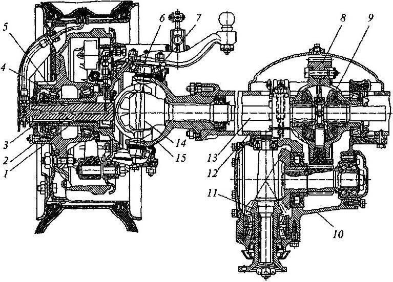 1 поворотная цапфа; 2, 13 наружная и внутренняя полуоси; 3 фланец; 4,7 конические подшипники; 5 ступица ведущего управляемого колеса; 6 шип; 8, 11 цилиндрическая и коническая шестерни; 9 дифференциал; 10 картер; 12 балка; 14 карданный шарнир равных угловых скоростей; 15 шаровая опора