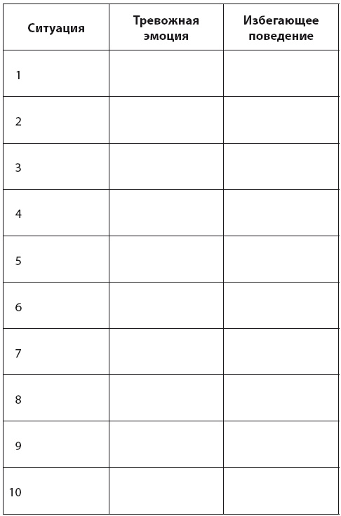 Перечислите десять ситуаций, которых вы стараетесь избегать. Оцените каждую из них по 100-балльной шкале по уровню стресса, тревоги и эмоционального дискомфорта, который вы в ней испытываете: