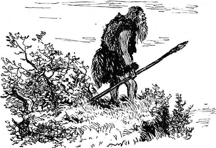 Когда он раздвинул гущу ветвей на краю берегового обрыва, можно было разглядеть его сутулую, коренастую фигуру. На нем было надето что-то вроде короткого мехового мешка, подпоясанного лыком. В прорезы высовывались жилистые руки, обмотанные широкими меховыми браслетами. Левая рука сжимала копье с каменным наконечником. Человек втягивал носом воздух, подставляя под ветер широкие ноздри.