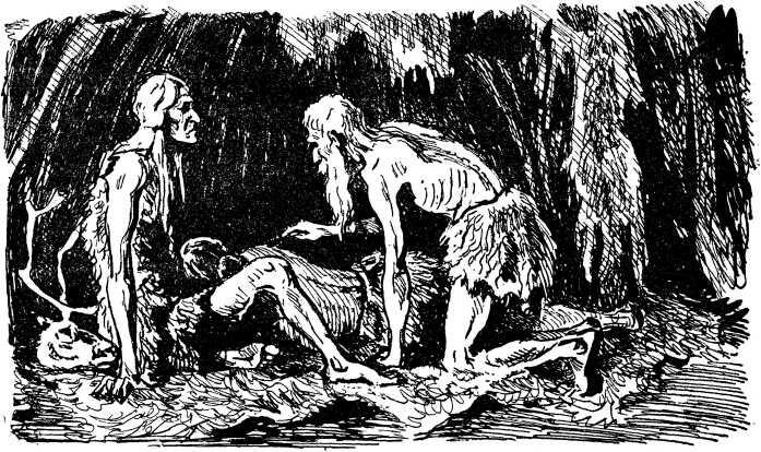Фао, самый старый из дедов, сгорбленный, но высокий, поднялся во весь рост и свирепо замахал кулаками. Серые глаза грозно сверкнули из-под мохнатых бровей. Он вдруг рявкнул на всю землянку, словно большой медведь. Женщины с визгом выбрались наружу и начали торопливо жевать отвергнутую пищу.