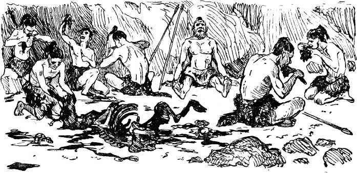 Теперь победители принялись за мясо. Калли и Тупу-Тупу каменными ножами вырезали мякоть вместе с ребрами и раздавали участникам пира. Женщины получили по куску мяса величиной с голову ребенка. Каждая из них захватывала его сперва зубами, потом острым кремнем отпиливала порцию перед самым носом. Так же делали подростки и дети.