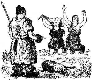 Охотники положили на землю убитого зайца и двух белых куропаток. Но решить дело без товарищей было нельзя. Нужно было их дождаться. Мужчины стояли молча, опершись на свои копья. Женщины уселись на землю и продолжали выть.