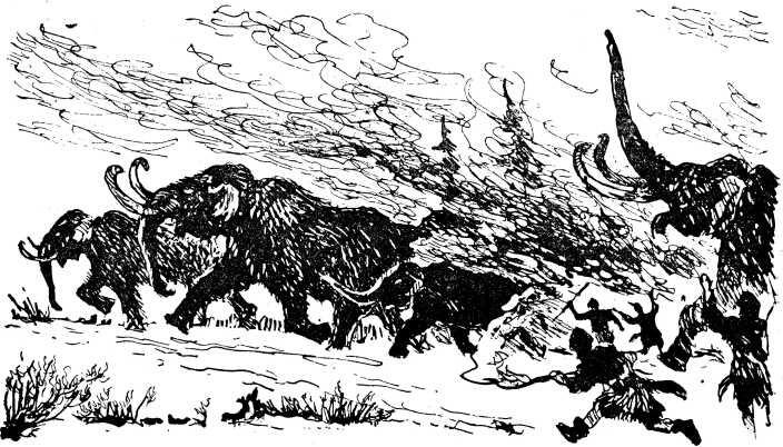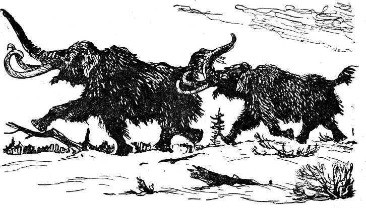 В лесу было светло и тихо. Ветер давно сорвал с деревьев пожелтелые листья. Снег устлал землю пухом пороши. Воздух был чист и спокоен. Копытные звери затаились где-то по темным чащам. Олени и косули старались поменьше оставлять после себя следов. Только мамонты и носороги никого не боялись. Они бродили по лесам и топтали тяжелыми ногами давно пробитые тропы.