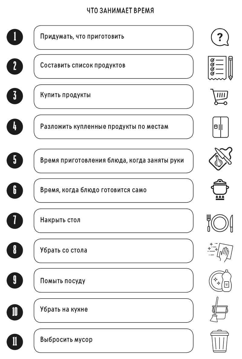 Самая частая ошибка расчета времени, которое тратится на приготовление еды, заключается в том, что учитываются только 2 процесса из 11: время, когда заняты руки, и время, когда блюдо готовится.