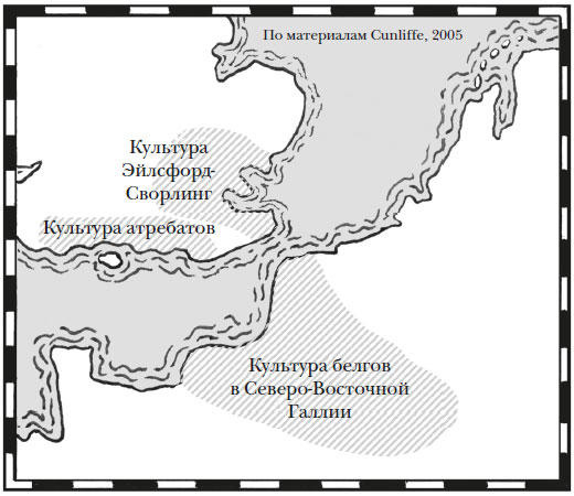 В глубине острова издавна жило благоденствующее население, в то время как приморская часть (прибрежный северо-восточный регион) была заселена сравнительно недавно пришельцами из страны белгов. Вождь белгов незадолго до вторжения стал в каком-то смысле верховным правителем в Британии. Современные археологи действительно выделяют в то время на Юго-Востоке Британии культуру Эйлсфорд-Сворлинг и культуру племени атребатов, тесно связанные с галльскими белгами.