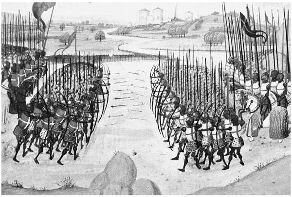 Картина, изображающая битву при Азенкуре, создана современником событий. Художник понимал, кто действительно сражался: все боевые действия велись незнатными лучниками, в то время как аристократическая конница осталась практически за сценой. Из «Хроник Ангеррана де Монстреле» (начало XV в.). Национальная библиотека Франции, отдел рукописей, manuscrit Français 2680, folio 208