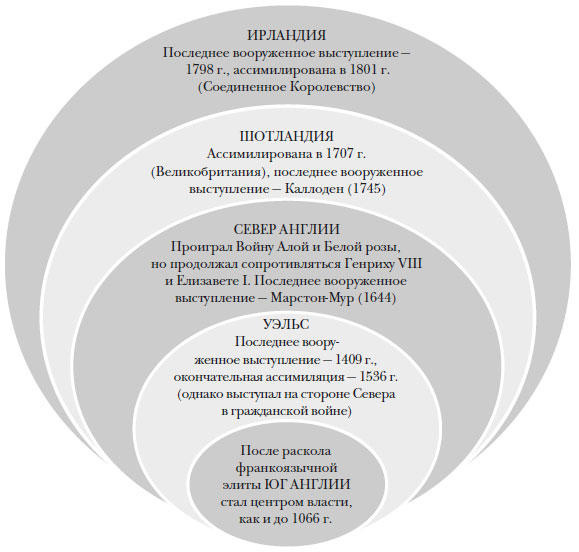 Рост империи южноанглийской элиты от распада франкоязычного единства (1399) до образования Соединенного Королевства (1801). Во всех случаях элита противника была ассимилирована первой