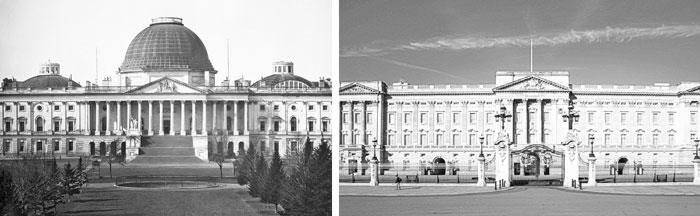 Слева: радикальный классицизм. Капитолий, Вашингтон, 1826 г. Дагерротип Джона Пламба, 1846 г. (© Creative Commons: US Lib Congress Prints & Photos Division, digital ID: cph.3c102103). Справа: роялистский классицизм. Букингемский дворец, 1834. Фотография автора