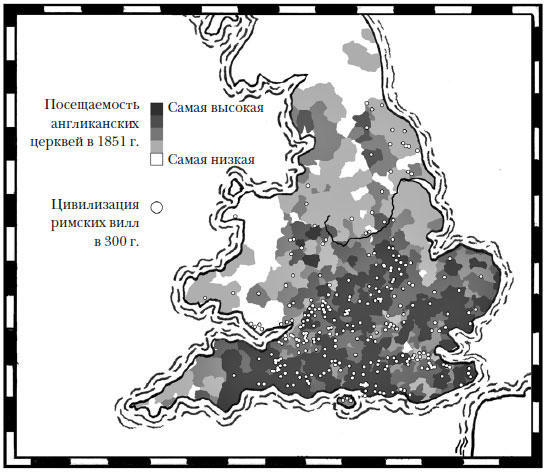 Самая высокая посещаемость англиканских церквей в 1851 г. Сильно коррелировала с расположением римских вилл в 300 г.