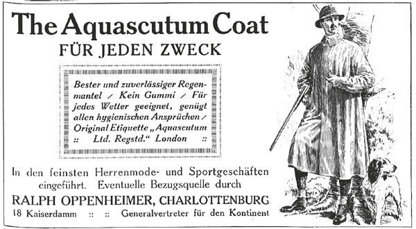 Реклама Aquascutum. Из немецкого журнала Simplicissimus, Issue No. 52; 23 March 1914 (Klassik Stiftung Weimar). Опубликовано Библиотекой герцогини Анны-Амалии в сотрудничестве с Немецким литературным архивом в Марбахе, а также Институтом исследований немецкой и мировой литературы и учебно-исследовательским центром истории немецко-еврейской литературы при Рейнско-Вестфальской технической высшей школе в Ахене