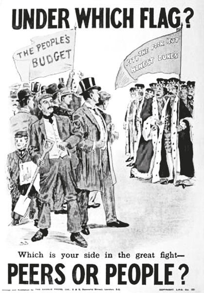 К сожалению, немецкий адмирал фон Тирпиц воспринял новую мирную и дружественную внешнюю политику Британии как признак слабости, так что он повысил ставку и запустил производство германских аналогов дредноутов. Тут же вновь зазвучал боевой клич тори: «Нам нужно восемь, мы это не бросим!»[43], и либеральному премьер-министру Ллойду Джорджу пришлось одновременно решать проблемы строительства военных кораблей (чего он делать не хотел) и введения пенсии по старости (к чему он как раз стремился). В отместку он предложил на 1909 г. «народный бюджет» с беспрецедентным уровнем налогообложения богатых и открыто приравнивал борьбу за его принятие к борьбе между национальными интересами и привилегиями тори. Консерваторы нанесли ответный удар, выступая в качестве защитников королевства от Германии, радикалов и гомруля.