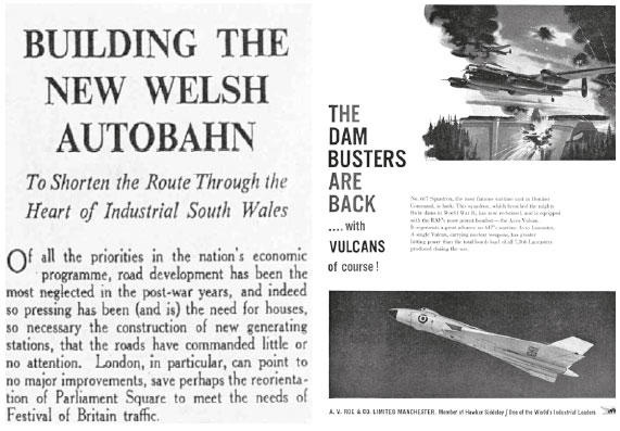 В 1953 г., через восемь лет после победы над Германией, в Великобритании только начали строить современные дороги наподобие немецких и даже не знали, как их называть. Зато строили новые самолеты на этот раз с атомными бомбами! Слева: «Постройка валлийского автобана». The Sphere, 7 ноября 1953 г. Справа: «Разрушители плотин возвращаются!». Flight, 15 августа 1958 г. (© Aviation Ancestry)