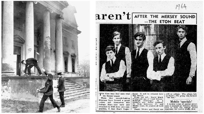 1964 г.: тори у власти, но кажется, что все прежнее отмирает. Слева: пожарная команда Лестера готовится к сносу Гарендон-холла, который больше не могут позволить себе содержать хозяева. Гарендон-холл, 1964 г. Фотография Сида Холла, Loughborough Monitor, 13 мая 1964 г. Справа: даже итонцы хотят быть похожими на тех крутых парней из Ливерпуля, которые завоевали Америку, потому что пели и говорили почти как американцы. «Мальчики из колледжа» газетная вырезка, июнь 1964 г. (© Jane Sellek, Eton College)