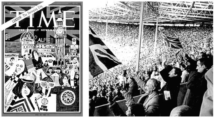 Слева: обложка журнала Time от 15 апреля 1966 г. (© Time USA, LLC). Справа: английские болельщики на финале чемпионата мира по футболу, 30 июля 1966 г. (© PA / Alamy)