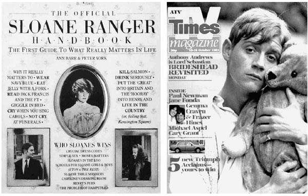 Слева: Питер Йорк, «Руководство Слоуна-Рейнджера» журнала Harpers & Queen. Ebury Publishing, 1982. Справа: обложка журнала TV Times (Thames / LWT area) за апрель 1983 г. Экранизация романа Ивлина Во «Возвращение в Брайдсхед» (студия Granada Television) с Джереми Айронсом и Энтони Эндрюсом в ролях Чарльза Райдера и Себастьяна Флайта