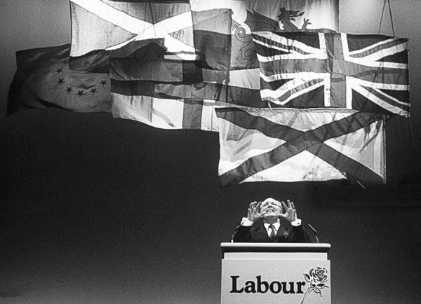 Нил Киннок на митинге лейбористов в Шеффилде, 2 апреля 1992 г. Кадры и звуки из Шеффилда затронули самые потаенные уголки южноанглийских душ. Намеренно или нет, но английский флаг на этом кадре расположен позади валлийского и флага святого Патрика1, не говоря уже о самом «Юнион Джеке» (© Mirrorpix / Alamy)