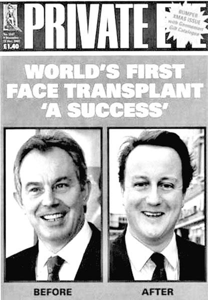 Обложка журнала Private Eye, 22 декабря 2005 г. Заголовок «Первая в мире успешная трансплантация лица» и далее «до» и «после»