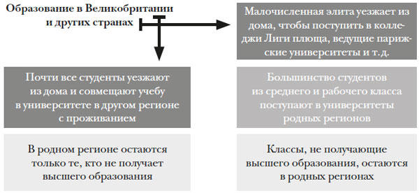 Система образования британской элиты школа-интернат, за которой следуют по меньшей мере три года в университете с проживанием в кампусе и индивидуальным попечительством, всегда была уникальной (до определенной степени скопировать ее удалось лишь в Америке). Средний класс был приглашен присоединиться к этой образовательной игре в 1960-х гг. на стадии университета. В 1992 г. большому количеству образовательных учреждений разрешили называть себя университетами, и они сразу же стали предлагать более дешевые разновидности прежней модели. К 2000 г. 25 % населения имело или получало университетское образование; так сформировалась критическая масса, а количество людей с высшим образованием продолжало расти. Любой достаточно амбициозный подросток к этому времени считал естественной необходимость оставить свой дом, семью, друзей и регион и провести важнейшие для формирования личности годы в монокультурной среде других амбициозных молодых людей, точно так же выкорчеванных из родной среды. Подобного не было ни в одной развитой стране.
