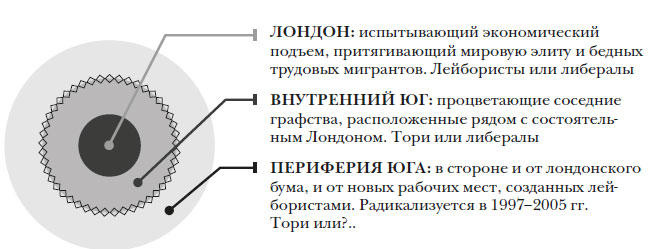 Ник Коэн, «История показывает, как бедность помогает правым» (History shows how poverty helps the right), Guardian, 12 октября 2008 г.Наконец-то бедные северяне и южане объединились, потому что при власти новых лейбористов небольшим городкам Юга, расположенным слишком далеко от Лондона, был нанесен двойной удар. Они не могли принять участие в лондонском буме, но и не получали новые рабочие места в общественном секторе, которые Браун дал северянам, поскольку те принадлежали к исконному избирательному ядру лейбористов. Периферийные районы Юга внезапно обнаружили, что они находятся в таком же экономическом кризисе, столь же политически несостоятельны и подвергаются такому же презрению, как и северяне. Сразу несколько незадачливых лидеров консерваторов нацеливали свою патриотическую риторику на этот юго-восточный район.